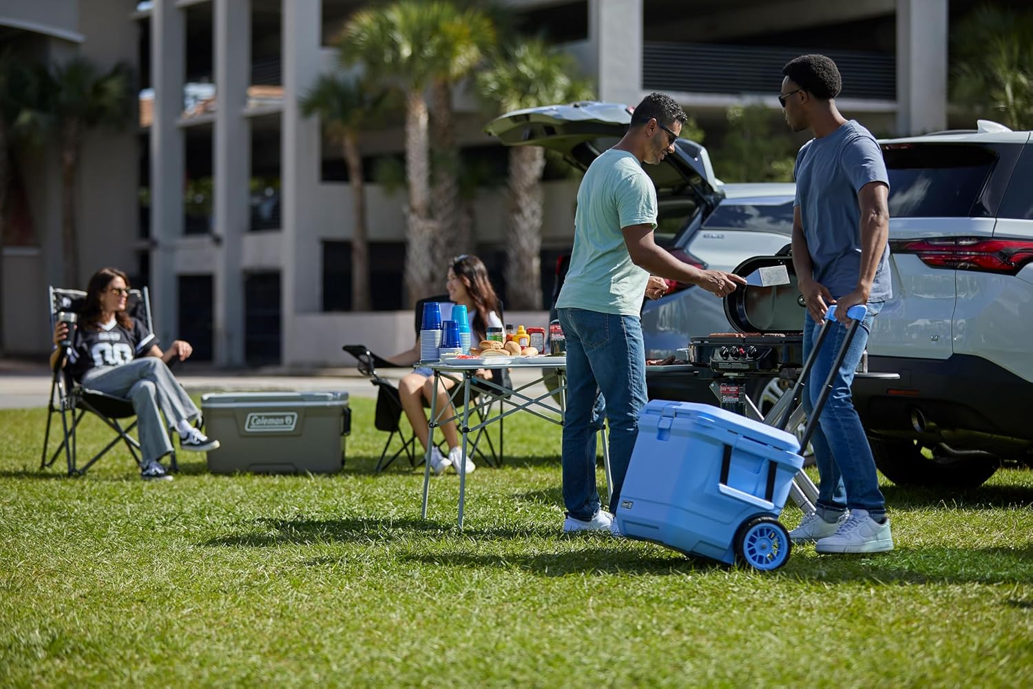 Geleira rígida Coleman Pro de 55 pintas, ultraleve e de alta qualidade, com isolamento extra espesso para conservar o gelo por até 5 dias, capacidade para 92 latas, rodas robustas.