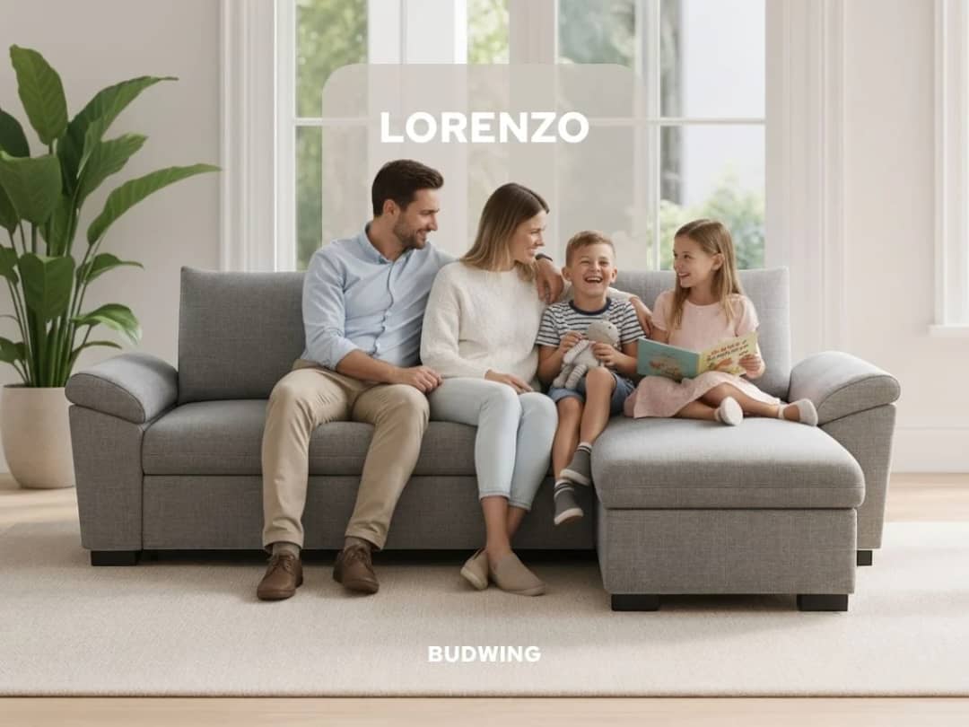 O sofá-cama Budwing Lorenzo é a peça central perfeita para quem não abdica do conforto nem da organização. Com um design contemporâneo de braços curvos, este sofá de 3 lugares adapta-se milimetricamente à tua sala graças à sua chaise longue reversível, que podes montar à esquerda ou à direita.
